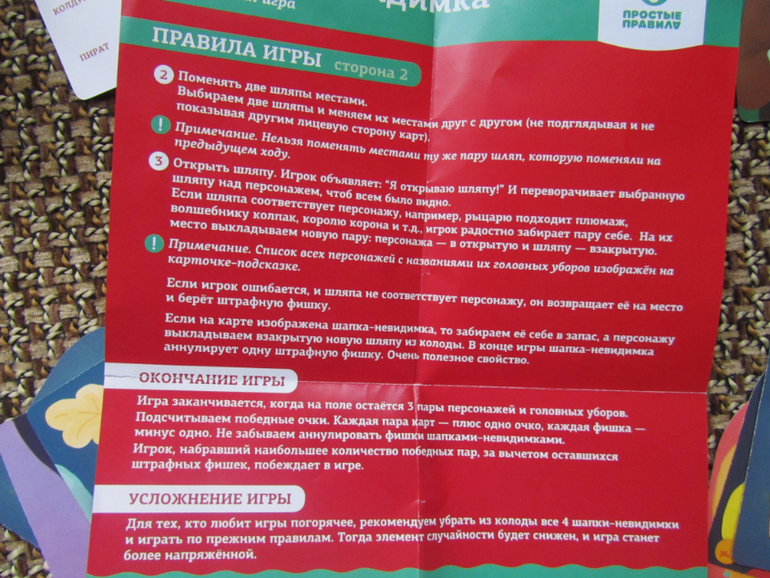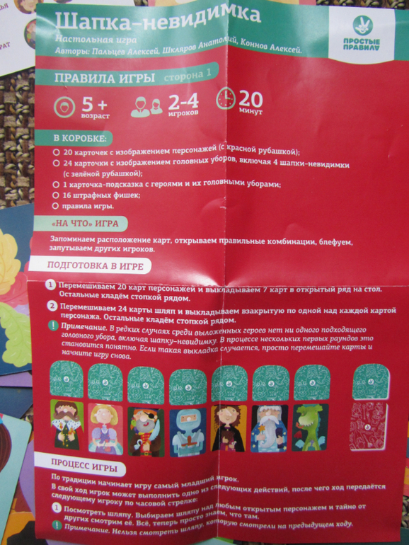 Рисунки на карточках с изображениями разных героев, есть и принцесса и цыганка, и пират и рыцарь, в общем игра будет и интересна и мальчикам и девочкам )) На коробке написано 5+ и я полностью согласна, так как в игре надо хитрить, а не дошкольнику на мой взгляд будет сложновато.Суть игры: раскладываются семь карт героев картинками вверх, поверх карт раскладываются карточки шляп только рубашкой вверх . Начинающий игру игрок выбирает одно из трёх действий - либо тайно открывает одну из карточек шляп ( чтобы вино было только ему одному), либо открыто открывает шляпу, но при этом , если шляпа не подходит герою над которым она лежит, игрок берёт себе штрафную фигурку шляпки, а шляпа заменяется на новую либо если шляпа подходит герою, игрок забирает себе и шляпу и героя. Ещё одно действие, которое может совершить игрок - это поменять шляпы у героев (например, если игрок тайно открыл шляпу короля, а сам король лежит крайний слева, игрок выбирает действие "поменять шляпы" и и меняет шляпу короля с неизвестной шляпой, которая лежит над королём и в следующий свой ход уже может открыть шляпу и забрать себе короля со шляпой и получить одно очко ))). Выигрывает тот, кто в конце когда уже закончатся все герои наберёт большое количество героев и сих шляпами )) Так вот, когда игрок меняет шляпы, соперник может догадаться для чего он это делает и в с свой ход может открыть вашу поменянную шляпу подходящую герою, именно поэтому в игре надо хитрить и запутывать соперника, чтобы он не догадался, где же лежит шляпа подходящая лежащему под ней герою )). Я боюсь, что не совсем понятно объяснила правила, поэтому выкладываю фото )))