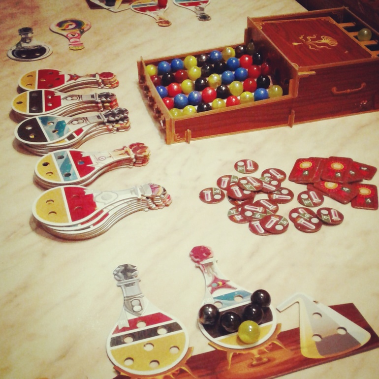 Ингредиенты представляют собой стеклянные шарики четырёх цветов, которые собираются по принципу "трёх в ряд". Очень интересная механика для настолок! Благодаря ей простая игра на сбор сетов превращается в магический практикум.