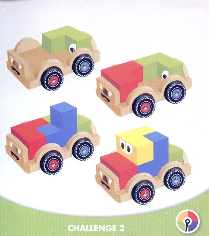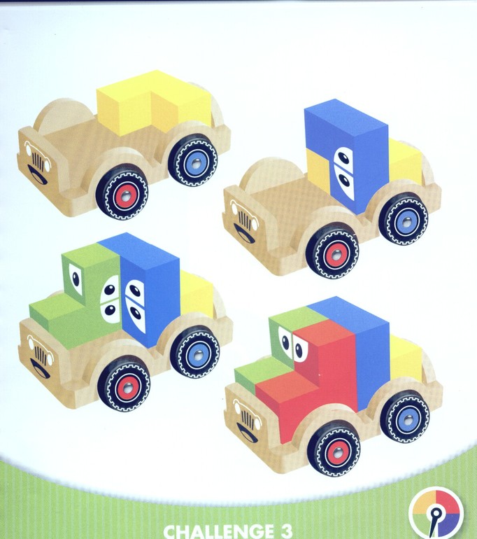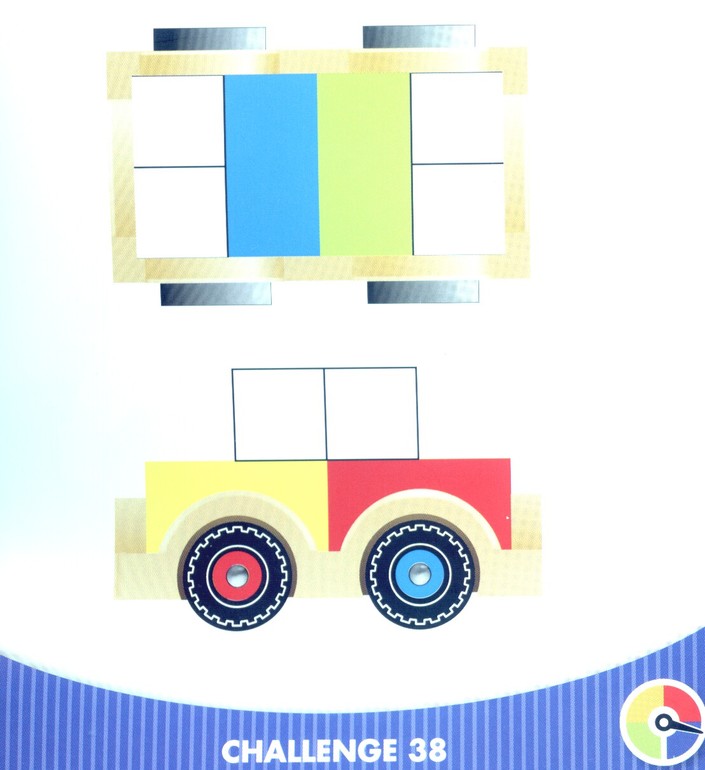 Решая второй уровень, меня не покидала мысль, что я просто переставляю местами цветные детали, а располагаю их одинаково. Второй уровень решался мною слету. Не очень понравилась картинка ответа. Хотелось бы еще вид сверху, а еще лучше пошагово, как в заданиях первого уровня или хотя бы картинку с тремя деталями. Но это мое мнение, может, ребенку и так будет понятно.