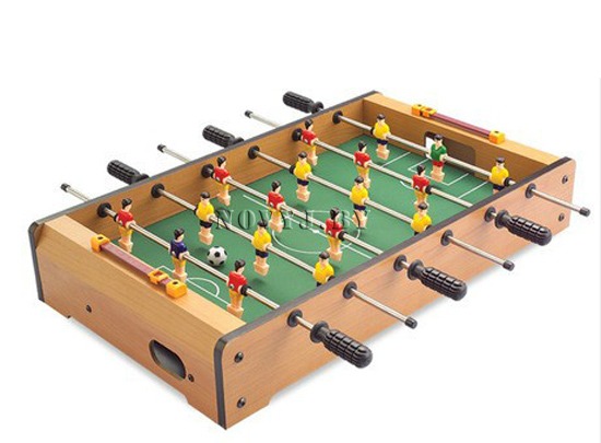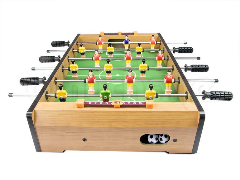 1. Настольный футбол. Для хорошей игры потребуется не мало внимательности и скорости реакции. Настольный футбол - отличный способ развить эти качества. Самые яркие впечатления, безудержная радость побед, горькая досада поражений, эмоции болельщиков, расстроенные вздохи и крики восторга - все это настольный футбол! Характеристики: Габариты: 48*28*8,2 см. Вес: 3,2 кг. Количество ручек: 6 (2*3). Количество фигурок игроков: 18 (2*9). Мяч: 2шт. Инструкция. Настольный футбол обладает всем необходимым, чтобы считаться настоящим Кикером. Каждому игру передается в управление по 2 ручки с тремя игроками на каждой. Первая команда одета в желтую форму, вторая - в красную. Вратари имеют цвет маек отличающийся от остальных игроков, как и в настоящем футболе. Настольный футбол наделен прочной деревянной конструкцией, которая надежно стоит на столе, не шатается и не гнется. Покрытие поля расчерчено футбольными линиями и устойчиво к протиранию. Площадка настольного футбола оборудована двумя воротами и линиями счета до 9 голов.