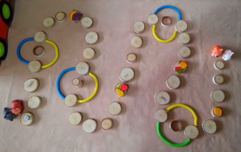 3. Ходилка "Берёзовая" из природного конструктора. Это самая любимая и в неё мы играем сейчас каждый день! Здесь волчок и мишка идут в гости к зайчику и лисичке.