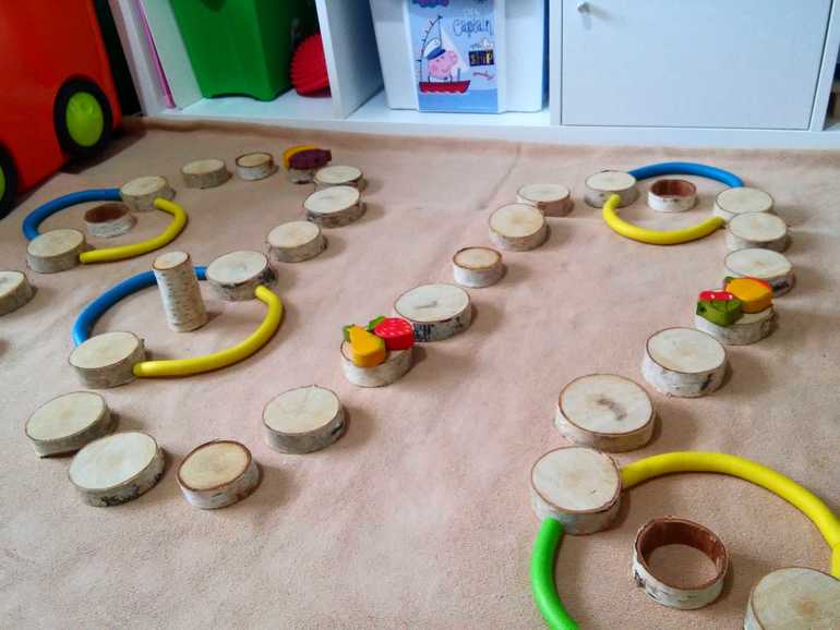 Основной плюс таких ходилок в том, что расставить элементы вы можете так как вам нравится. Дорога может быть прямой либо изогнутой. Можно сделать путь длиннее, а для ребенка помладше наоборот сократить расстояние до финиша. Какие ловушки/помогалки и где будут расположены зависит только от вашей фантазии. Также ребенку можно доверить самому сделать дорожку для путешествия и предложить расставить, например, кубики самостоятельно. Кроме того такая тактильная игра-ходилка подойдет для начинающих игроков, ведь здесь можно всё потрогать! А после игры из того же конструктора всегда можно что-нибудь вместе построить. В общем, попробуйте, вам понравится 😉