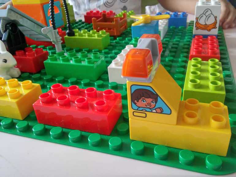 1. Ходилка "Леговая". Это была самая первая наша фантазия. Понадобилась строительная пластина (можно попробовать, кстати, и без неё, но с пластиной гораздо проще и удобнее), основные и дополнительные элементы конструктора (цветочки, лестницы, ящики и т.д.)