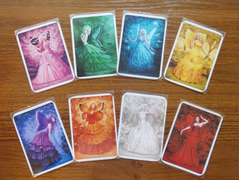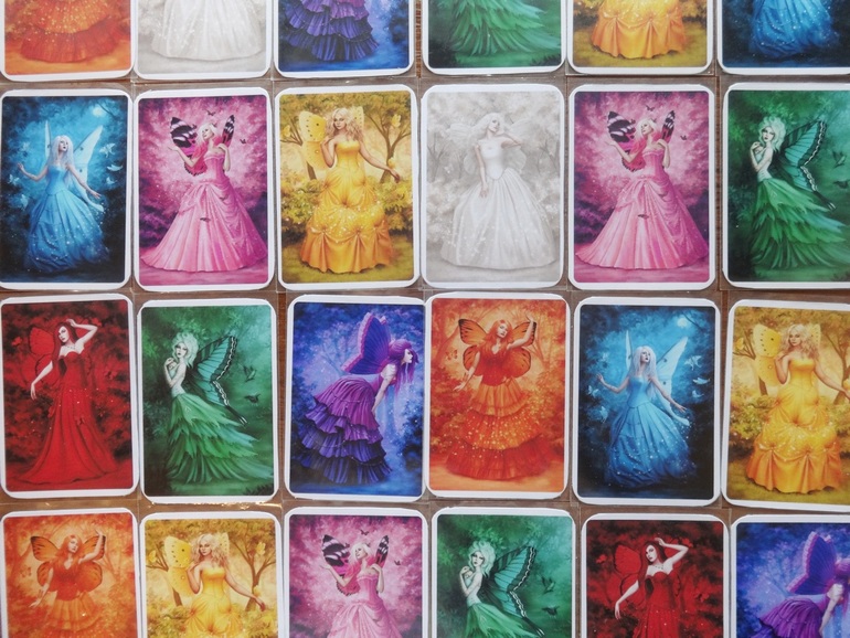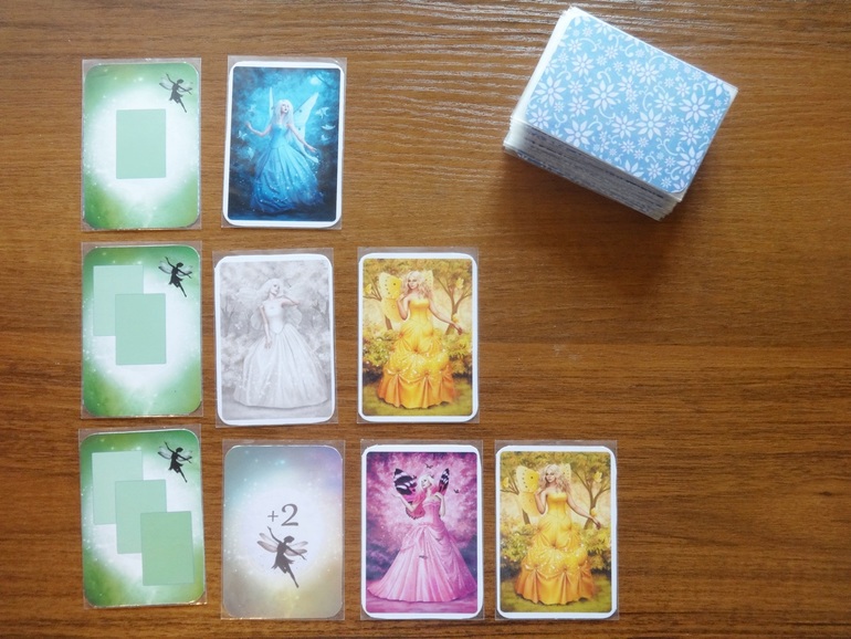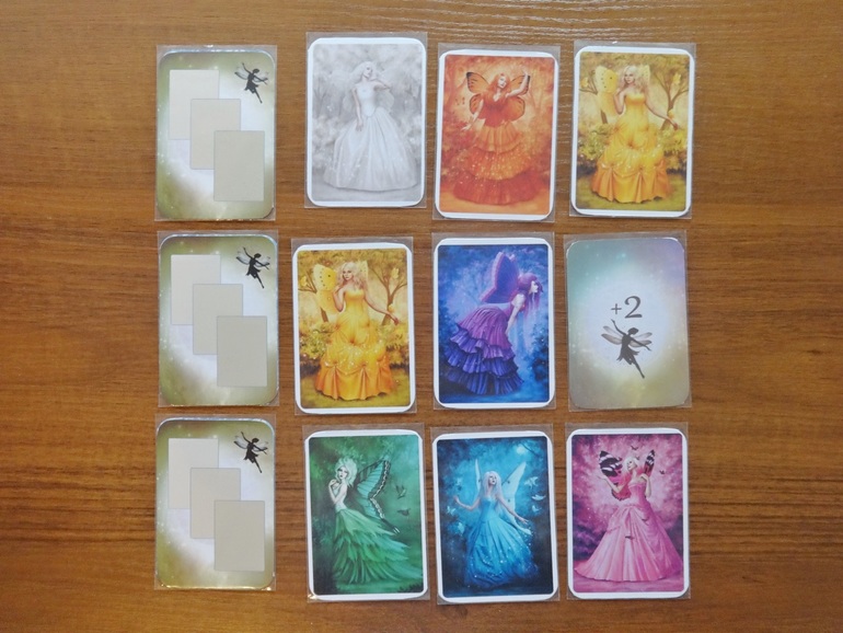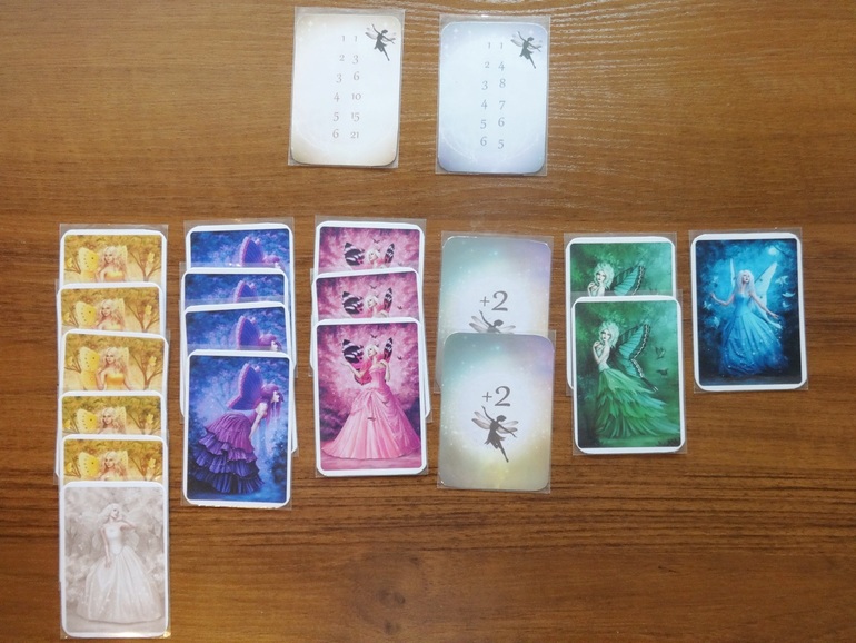 Игра длится несколько подобных раундов. В конце игры игроки подсчитывают очки. Белая фея - это джокер, она в конце игры приобретает любой цвет, нужный игроку (их в колоде всего 3). На фото ниже у игрока 5 цветов фей: 3 приносят очки (желтый, фиолетовый и розовый ряды), карты "+2" приносят по 2 очка, зеленые и синяя феи очки отнимают.