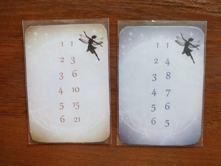 Это наиболее простой вариант подсчета очков (мы пока только по нему и играем), есть еще другой, посложнее, с ним процесс игры проходит немного по-другому (простой на коричневой стороне, сложный на фиолетовой). 1 фея - одно очко, 2 феи одного цвета - 3 (или 4 в зависимости от варианта подсчета) очка, 3 феи - 6 (8) очков и т.д.
