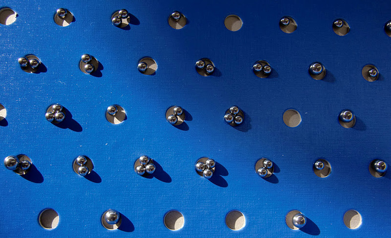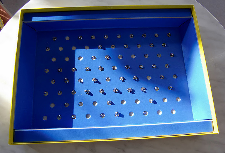 Собираем игровое поле. Для этого вытаскиваем все, что есть в коробке, кроме синего поля с отверстиями; высыпаем туда наши стальные шарики;