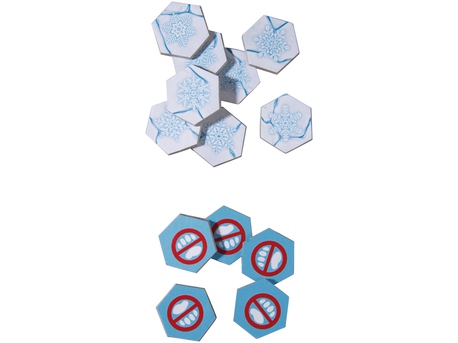 - снежинка, Вы можете «заморозить» любую лунку или наоборот «оттаить» ее, т.е. если Вы кладете фишку «снежинка» на открытую лунку, то считается, что она замерзла, и замерзла так основательно, что Вы не можете ее ни пробить киркой, ни тем более ловить из нее рыбу, а вот ходить по ней можно, как по обычному льду, и можно на ней останавливаться. И наоборот, если Вам выпала «снежинка» на кубике, Вы можете «разморозить» лунку, т.е. снять с нее фишку с изображением кристаллика льда.