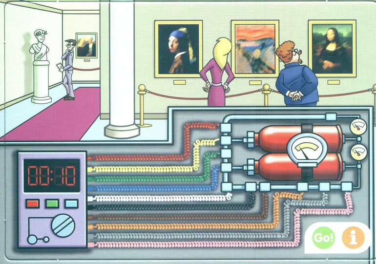 Профессор Мэд хочет помешать открытию выставки в музее. Для этого он тайно заложил бомбу с веселящим газом. Сможешь ли ты обезвредить бомбу прежде, чем она взорвется? Профессиональный сапер назовет тебе по рации три цвета проводов, которые следует перерезать за 10 секунд, касаясь их ручкой tiptoi. Так ты предотвратишь взрыв и получишь медаль. Осторожно, если ты заденешь неправильный провод, газ попадет в зал, у посетителей начнется истерика, и профессор Мэд получит медаль.