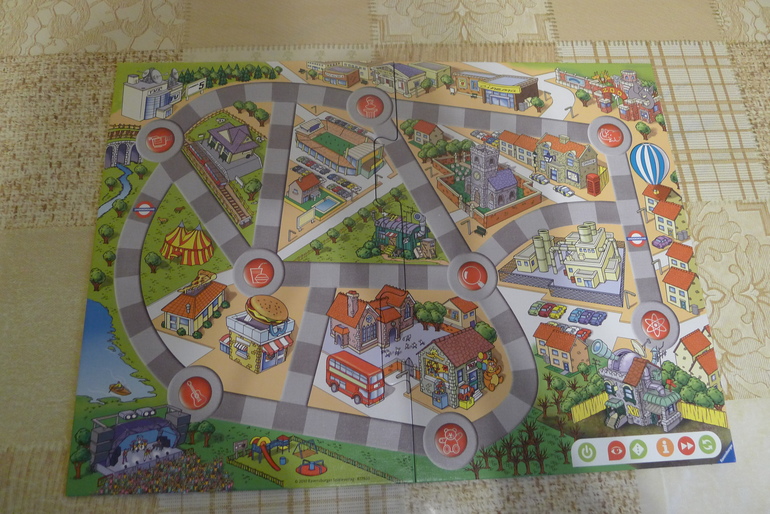 В начале игры ручка сообщает 3 места, куда нужно сначала дойти игрокам. Кубика нет, вместо кубика ручка tiptoi сама скажет, на сколько шагов нужно продвинуться. Помечаем озвученные ручкой места преступлений красными кольцами и двигаем свою фишку на количество шагов, указанное ручкой.