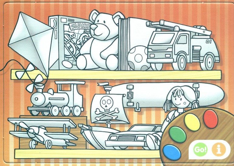 Чтобы лишить детей радости игры с разноцветными игрушками, профессор Мэд перекрасил их в серый цвет. Помоги владельцу магазина вернуть их первоначальный вид. Для этого коснись ручкой сначала одной из красок. Владелец магазина подскажет тебе, какие игрушки следует раскрасить этим цветом. Если ты правильно раскрасишь 4 игрушки, то получишь медаль. Если нет, то победит профессор Мэд.