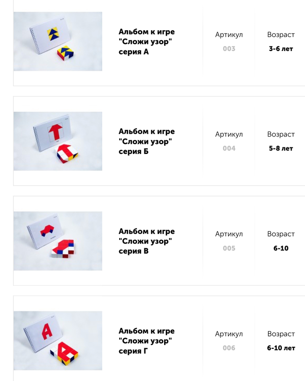 У нас сложи узор и уникуб. Какую выбрать, смотрите по ребенку, насколько он раньше сталкивался с подобными головоломками. Сложи куб мне показалась немного проще, потому что картинка складывается в одной плоскости. А Уникуб это более пространственное мышление, нужно сложить в трех плоскостях. К обеим играм есть альбомы с заданиями, но эти же задания есть и просто в инструкции к играм (в уменьшенном размере). Так как ребенку уже 6 лет, то можно вполне обойтись и без альбомов, инструкциями, задания те же.