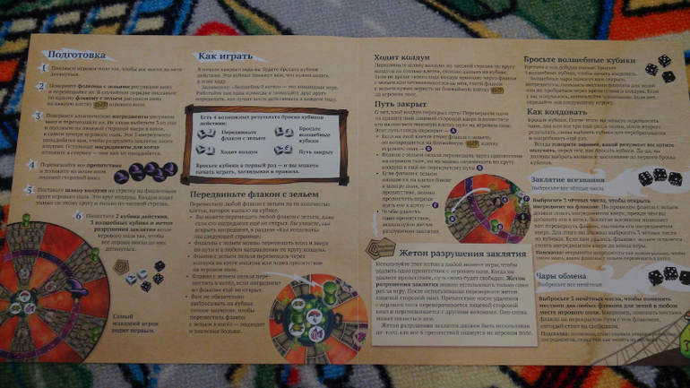 Кидаем одновременно два больших кубика и делаем ход соответствующий изображениям на кубиках, пересказывать не буду, можно почитать правила. Игра заканчивается, когда все три флакона с нужными ингредиентами достигнут котла, прежде чем, злой колдун перегородит им дорогу.