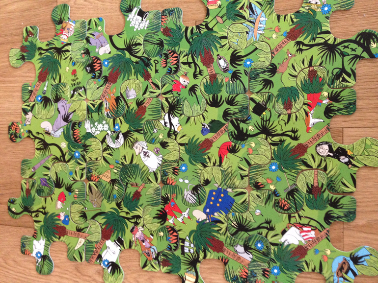 Каждый игрок получает рюкзак, затем по очереди из колоды берется карта и надо найти предмет или героя "в джунглях". Кто первый найдет, тот получает жетон с фруктом и кладет в свой рюкзак. Если на карточке изображена комета рядом с предметом, то при итоговом подсчете очков она приносит больше баллов,чем фрукт. Вот пример карточек: