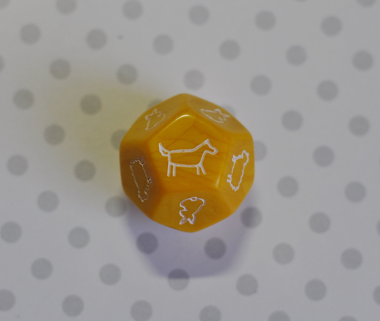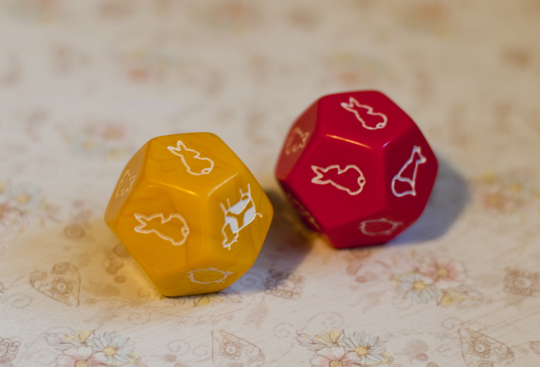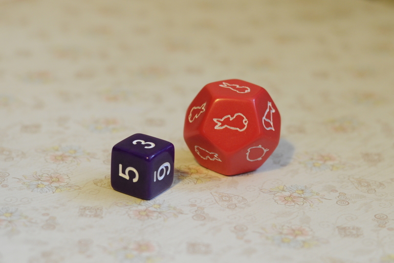 Больше всего на кубиках, естественно, кроликов. Животинка вам достаётся (на начальном этапе игры) только если на двух кубиках одновременно выпало одно и то же животное. А дальше - уже в процессе игры (когда животных вы скопили) - выпавший на кубике зверь (даже один!) приносит вам потомство от каждой имеющейся у вас пары этого вида животных. Звучит непонятно, но правила увеличения стада просты, это становится ясно в игре.