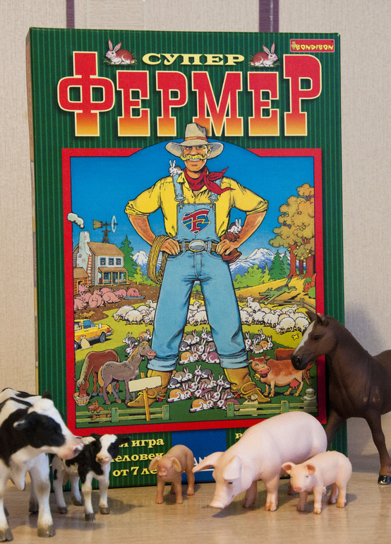 Стратегия в игре есть в какой-то степени, ведь игрок сам решает, кого и когда выменять, но она вся рушится, если выпадает лиса или волк. Например, на момент, когда муж победил в игре (собрал всех и вся, имея при этом пересорт и собак), у меня был полный, простите, голяк! Даже одного вшивого кролика не водилось... Удачливый игрок-фермер, конечно, защищает себя от казуса с волком, приобретая собаку. В игре 2 вида собак - маленькая (недорогая) - от лисы (лиса лишает фермера только кроликов) и большая (дорогая) - от волка, выпадение которого на кубике сулить потерю всей накопленной живности.