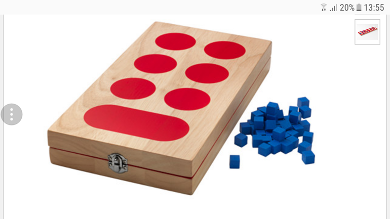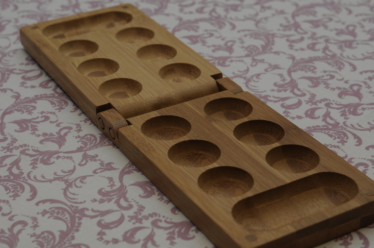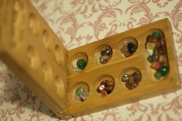 В скромной и хлипенькой коробочке находится лишь складное (у нас дорожная версия) деревянное поле с лунками и камешки.