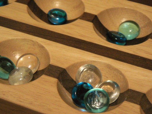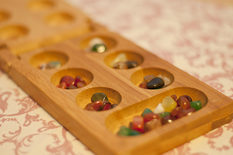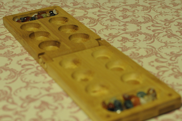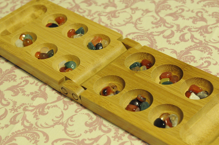 У каждого игрока во владении 6 круглых лунок и одна продолговатая большая - собственно, сам калах, который находится справа от игрока (то есть каждая половинка поля, где 6 лунок в ряд, принадлежит "дуэлянту"). В начале игры каждый игрок раскладывает камни в лунки (по 4 шт в лунку при пустом калахе). Вот так: