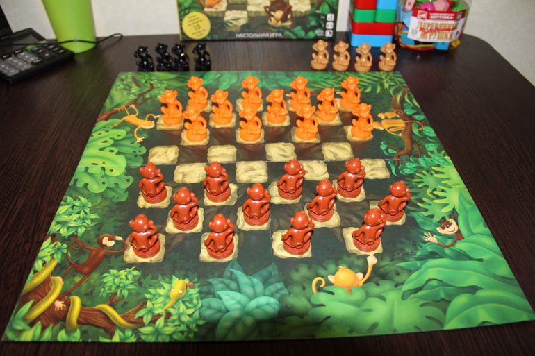 Поле у игры плотное и красивое. Серые клетки поля представляют собой каменные выступы, на них по правилам и предполагается играть.Основные игровые фишки в виде коричневых и рыжих обезьянок, для дамок специальные черные и бежевые обезьянки.