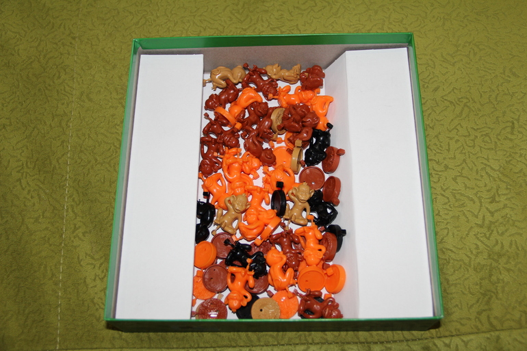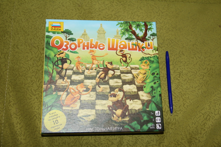 Люблю игры от «Звезды», в моей коллекции их собралось не мало. «Озорные шашки» я планировала купить чуть позже, когда мои малыши подрастут, но во всем виноваты скидки))). Буквально за пару дней до ФМ эта игра появилась у нас дома и показать её я просто обязана. Шашки, наверное есть дома у каждого, у нас тоже по всему дому можно найти чёрно-белые шайбочки. Но когда я увидела этих милых обезьянок, то решила, что они обязательно когда-нибудь должны быть у нас. Коробочка средних размеров, внутри поле, правила и разбросана куча фигурок, которые надо еще собрать. Пришлось немного повозиться и все фигурки были собраны(кстати, собралось все отлично).