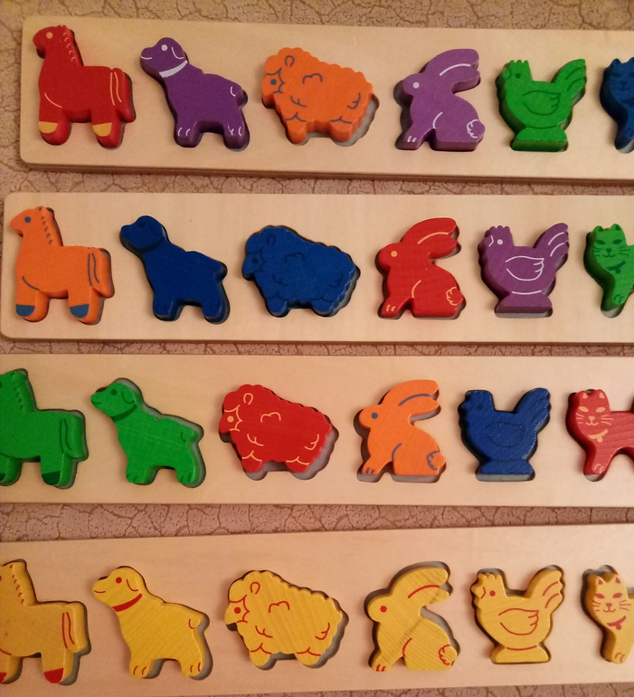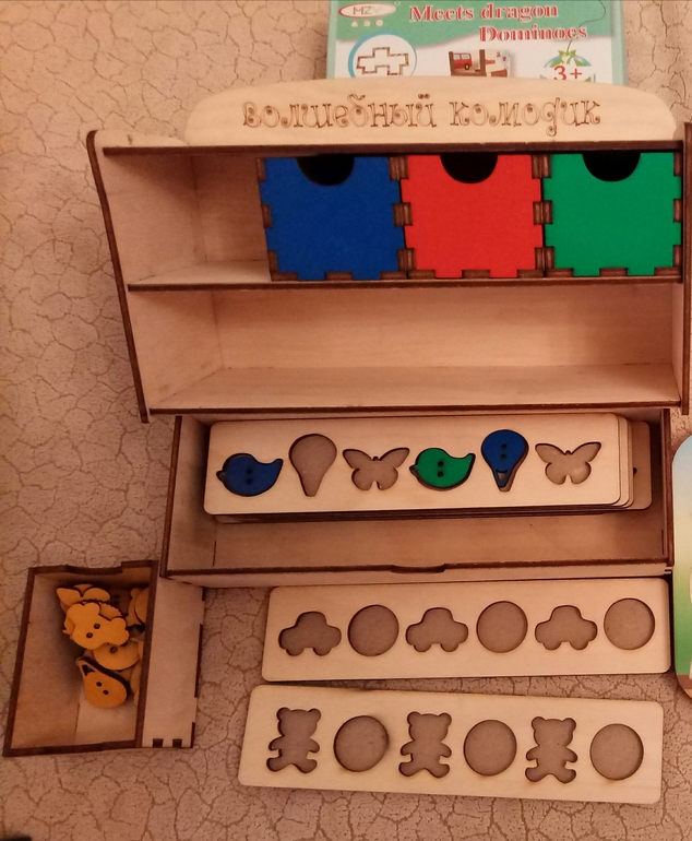 А какой простор для различных заданий при наличии стольких деревянных деталек. Ну и конечно, по правилам планируем играть) Жаль только, раньше не видела такую прелесть, в год бы уже купила, и еще , конечно, двух основ не хватает, было бы интереснее все игрушки по цветам раскладывать. Спасибо Анастасии, что показала эту замечательную игру!