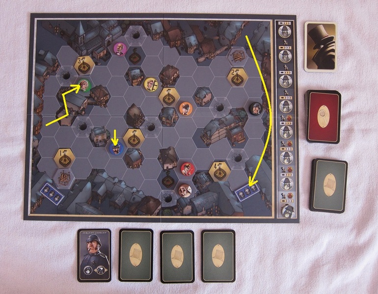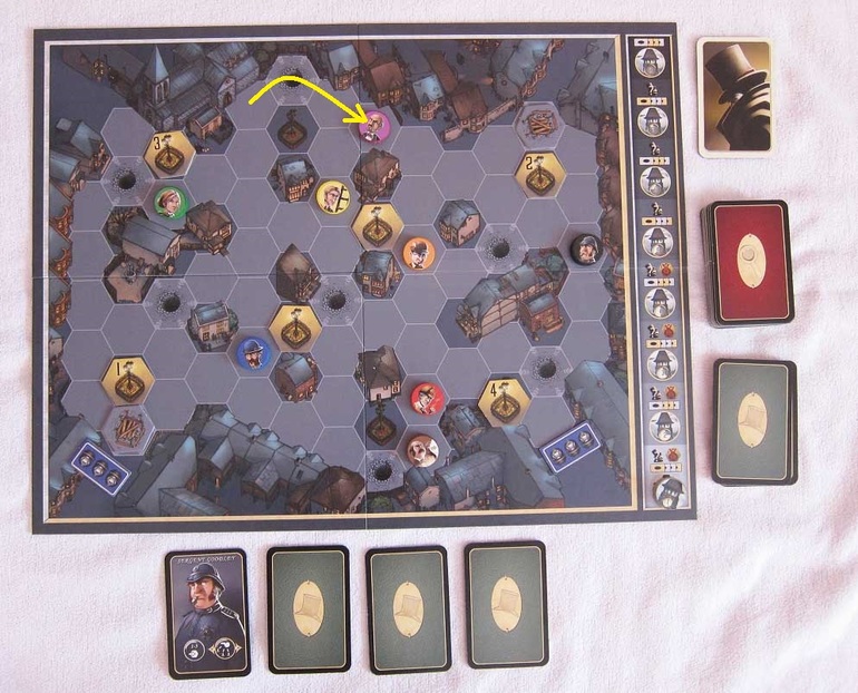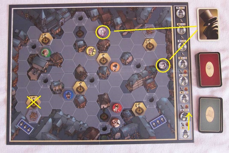 Лестрейджа игрок перемещает на один гекс, чтобы он тоже не ушел из-под фонаря. Способность инспектора - перемещать полицейский кордон. Игрок перемещает кордон в правой стороне района, пытаясь своими действиями запутать Детектива.