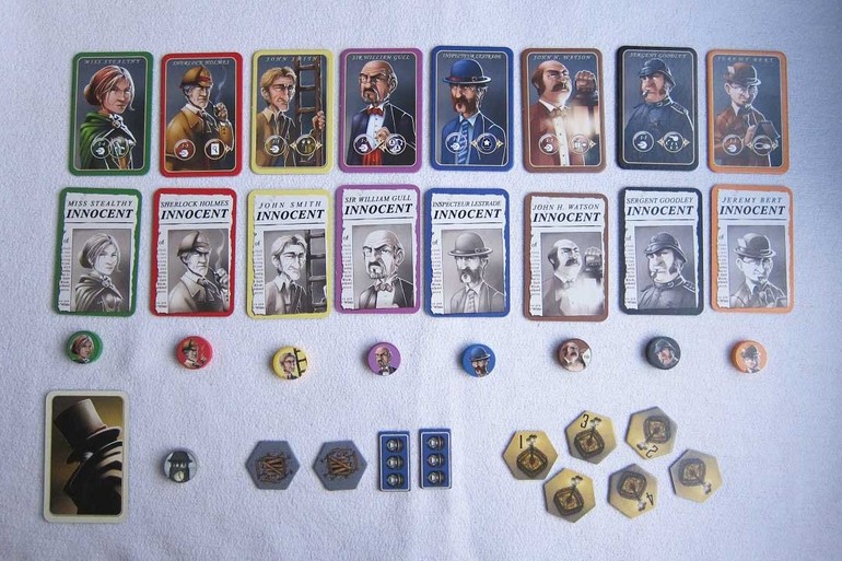 Карты персонажей - верхний ряд, карты алиби - второй ряд, жетоны персонажей, карта Свидетеля, у которой две стороны - видимая и невидимая, счетчик раундов, тайлы закрытых люков, полицейских кордонов, заженных фонарей. Вот и весь реквизит.