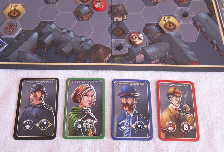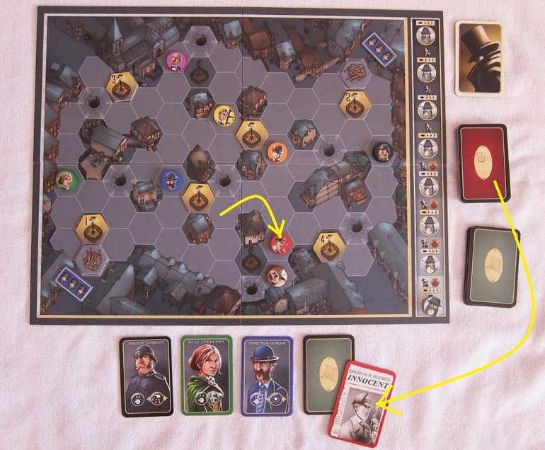 Холмс может переместиться на 1, 2 или 3 клетки (гекса) и взять одну карту алиби. Детектив перемещает Холмса на три клетки таким образом, что он становится рядом с Джоном Ватсоном. Раньше Ватсон был невидим, а теперь рядом с Холсом становится видимым.