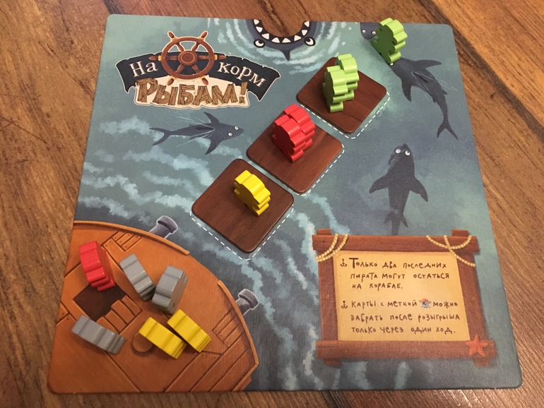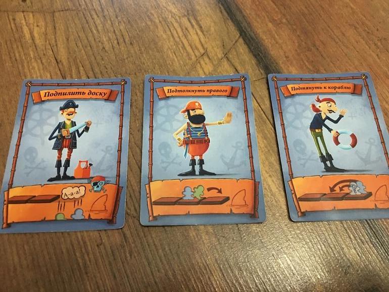 семейные игрыСемья у нас дружная, но в настольных играх любим сражаться друг с другом до последнего, сделать подлянку и т.д.)) Эта игра полностью удовлетворяет наши пожелания, ведь в игре побеждают двое выживших, а остальные идут на корм рыбам!! Иногда играем и до одного победителя, но это существенно удлиняет игру. У каждого игрока есть по три пирата и набор карт, на которых указаны определенные действия, а еще игровое поле, где вы стоите на корме корабля и рядом три шаткие досточки. Смысл игры, как раз и сбросить игроков с досок, подталкивая их к воде или подпиливая доски, при этом стараясь, чтоб хоть один свой пират выжил в этой борьбе.)) Игра длится несколько раундов. В начале каждого раунда игроки выбирают три карты и кладут их рубашкой вверх в том порядке, как их будут открывать, продумывается стратегия.