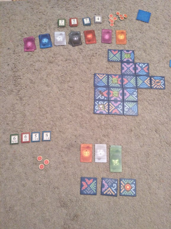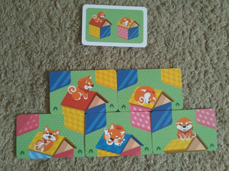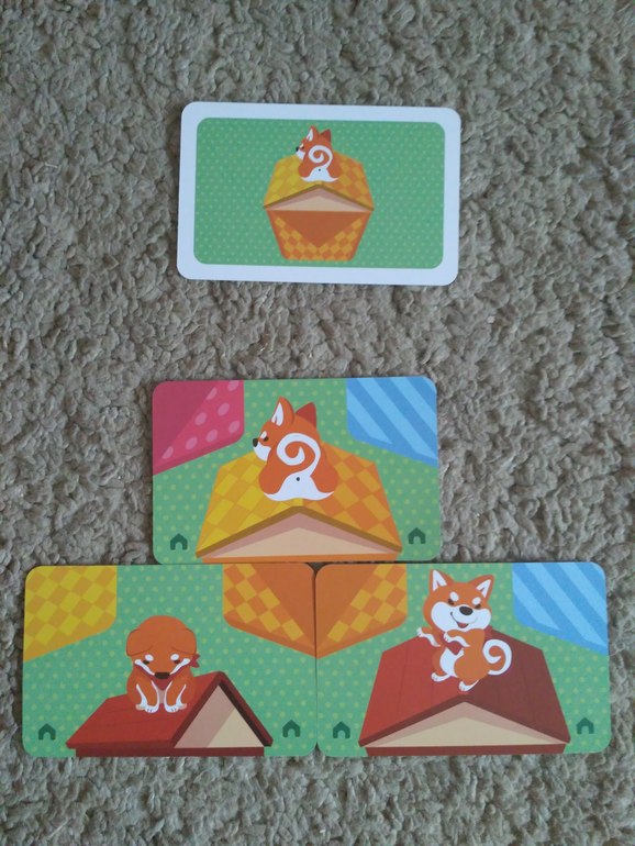 Нужно строить домик или домики по подобию. У каждого игрока по 9 двусторонних карт с крышами и стенами, из них нужно собрать определённый.
