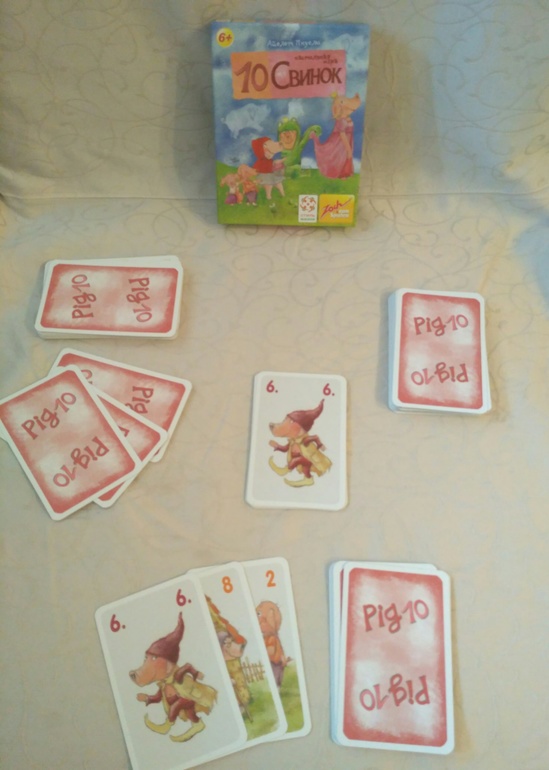 По прошествию времени могу сказать что в лидерах у нас сейчас ! Игра оказалась не только полезной и не сложной ( в ней сложение и вычитание в пределах 10) , но и весёлой!! Очень нравится играть втроём! Там уже и азарт добавляется, и борьба идёт, особенно когда в центре стола довольно приличная колода насобиралась. Кому же она достанется?? Ну и фактор удачи здесь присутствует, ведь на руках по 3 карты, и может просто не быть никакой подходящей.
