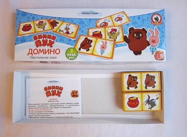Дома есть несколько наборов домино (с машинками, зверюшками, с точками), но сын к ним относится нейтрально. А вот домино с любимыми героями, включая пчелу и горшочек мёда, к которым ребенок тоже неровно дышит, "выстрелило". Начали играть по правилам.