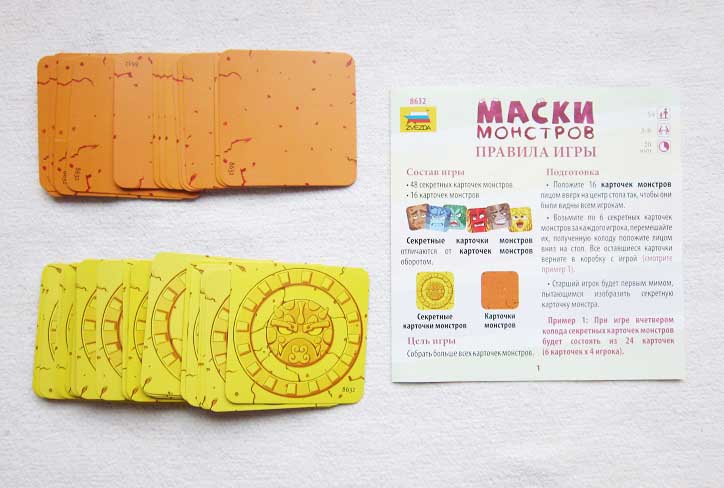 Но обо всем по порядку. Состав игры: колода карт (оранжевая рубашка - карточки монстров в количестве 16 штук, желтая - секретные карточки монстров в количестве 48 штук) и правила.