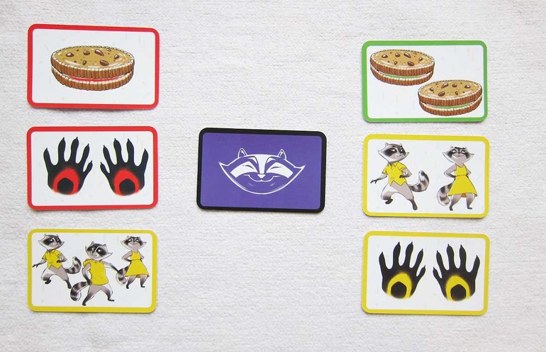 В общем, нужно найти сет, в котором обязательно будет три разные картинки: еноты, печенье и следы.