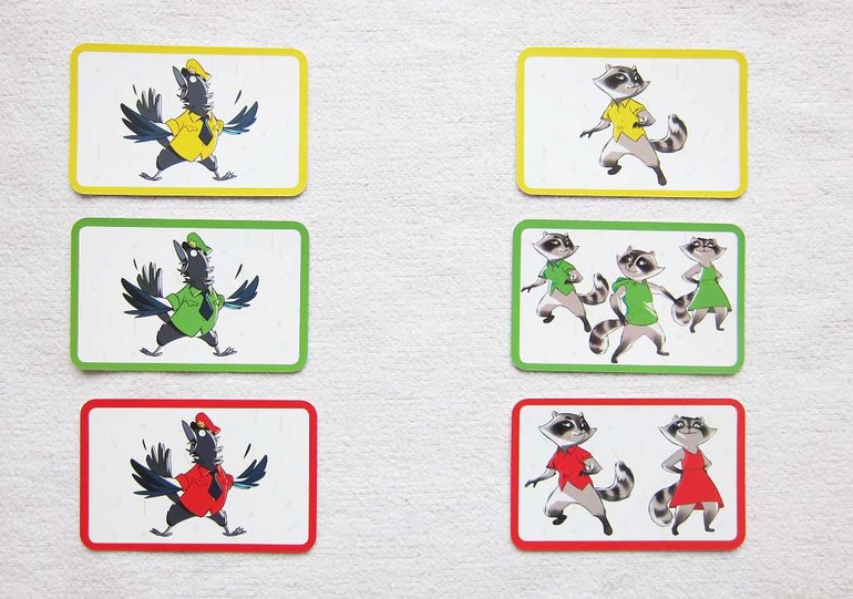3. Три карточки разных цветов с одинаковым количеством предметов: 3 красных енота + 3 желтых печенья + 3 зеленых следа.