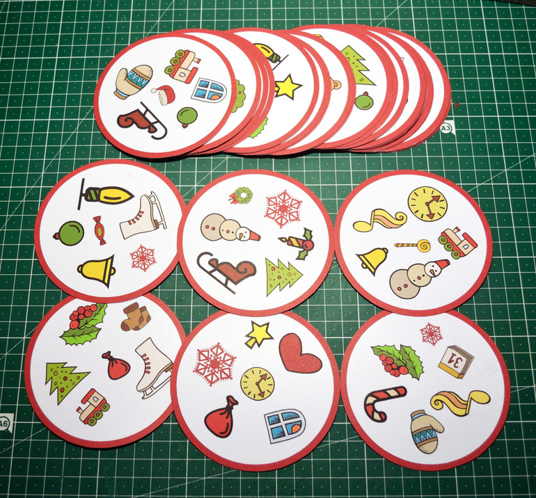 Версия доббля простая-малышковая. Всего по 6 картинок на карточке. Зато новогодний ))