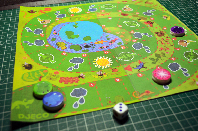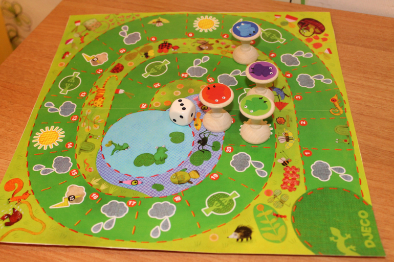 Там основной интерес игры заключается в том, что процессе перемещения к заветному пруду фишки-лягушки переворачиваются, превращаясь в зонтики, останавливаясь на тучке, переворачиваются обратно на солнышке.