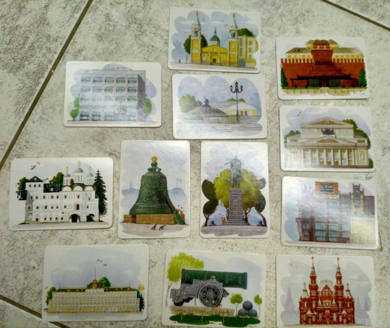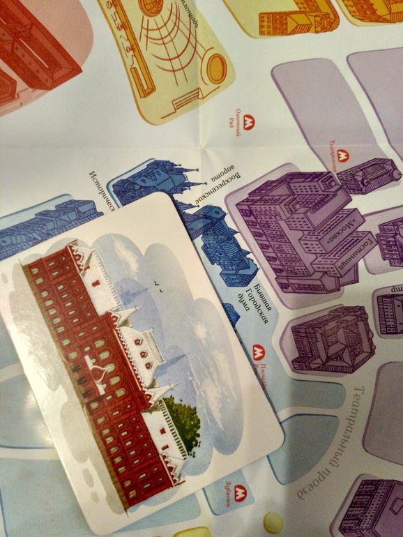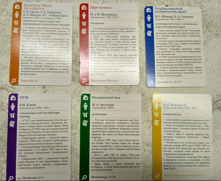 На поле есть значки - экскурсии и вопрос. На экскурсии нужно взять карточку из стопки того цвета, в зоне которой находится фишка и прочитать о нём. А вопрос - назвать здание из общей стопки, которая лежит рисунками вверх и несколько фактов о нем. Но мы пока информацию тоже читаем с карточки.