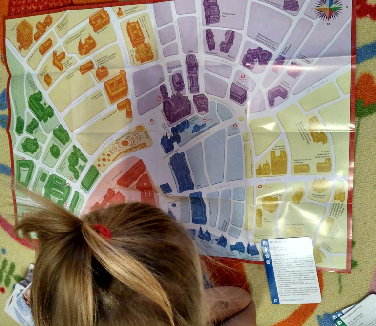 Ну а после игры мы находим на карте здания, с которыми познакомились в этой партии, работа с картой для Ани новый вид деятельности, и ей это интересно, она с удовольствием её разглядывает, ищет, сопоставляет.