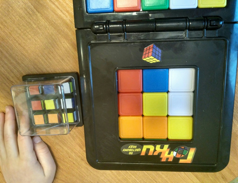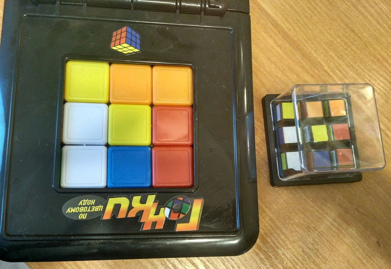 Маленький кубик показывает какую цветовую комбинацию нужно собрать.