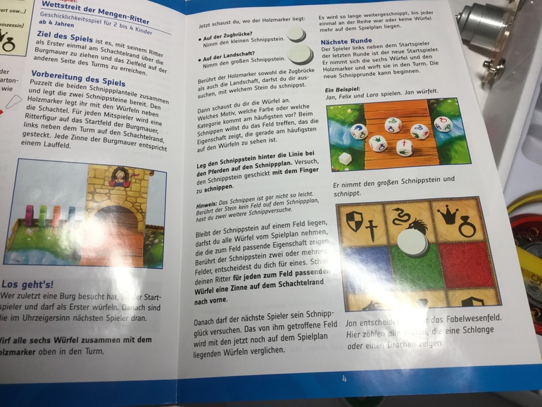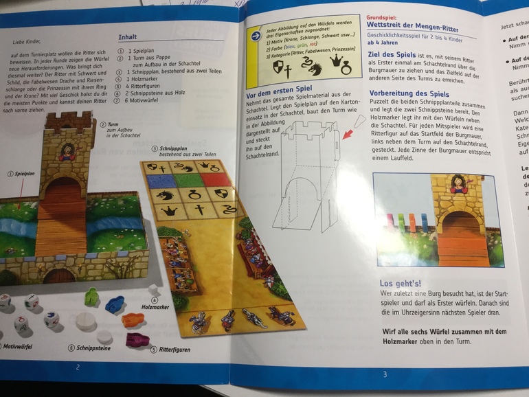 Суть такая: вы собираете башню на поле, рядом с полем выкладываете тернирную таблицу (на ней нарисованы клетки с фигурами и цветами), рыцарей устанавливаете на стене. Цель - рыцарь должен первым пройти весь путь по стене.