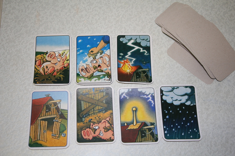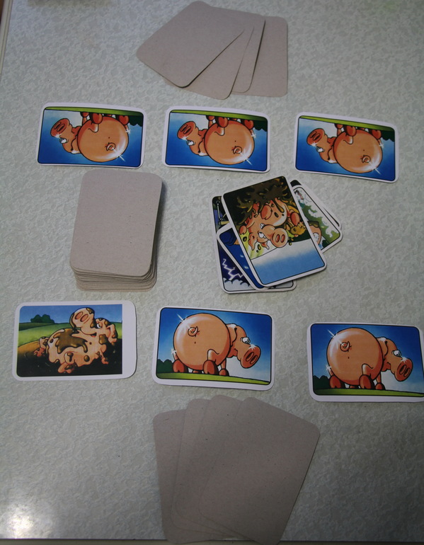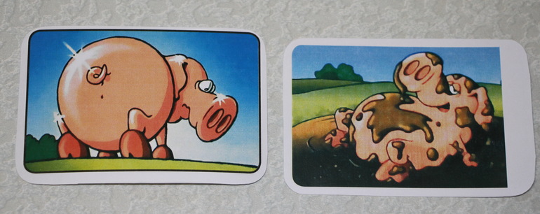Каждому игроку раздается по три карточки хрюшки, карточки двухсторонние, с одной стороны хрюшка чистая, аж сверкает, с другой грязная и довольная.