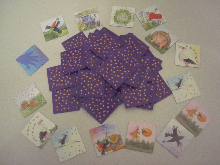 В комплект входят 64 карточки, образующие 32 пары. Карточки крупные 5,7 см. на 5,7 см. и изготовлены из добротного картона (по плотности не уступающего фирме HABA) с приятной глазу «рубашкой»: жёлтые звёздочки на сиреневом фоне. Таким образом, их удобно захватывать детскими ручонками, и они точно не порвутся и не помнутся в процессе игры, как, скажем «Зверобуквы».