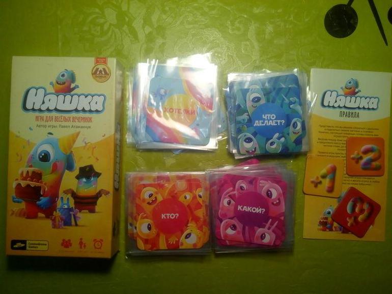 Затем ведущий открывает глаза и зачитывает все варианты, затем выбирает по его мнению самый удачный ответ, раздает жетончики (+3,+2,+1). Игроки оставляют у себя в отдельной стопочке, сответственно, 1, 2, 3 карты, как победные очки, а остальные карты в сброс. И так пока каждый не побывает ведущим, затем подсчет очков и объявление победителем одного из игроков!)