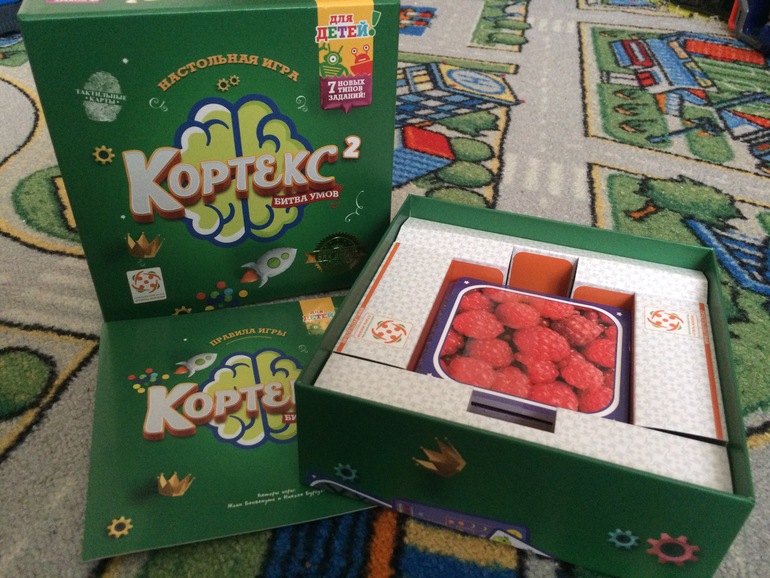 Добрый день! 90 карт (80 карт заданий, 10 тактильных карт), 24 фишки победных очков (по 6 фишек каждого цвета - фиолетового, жёлтого, оранжевого и зелёного)