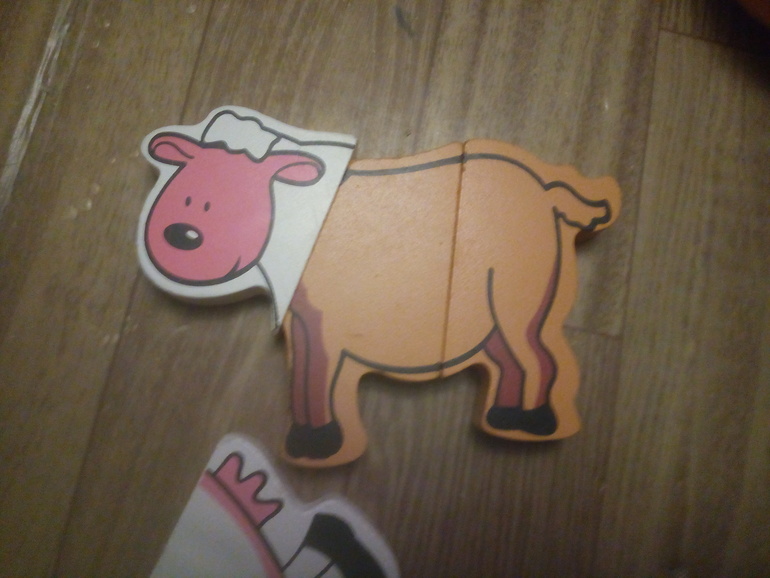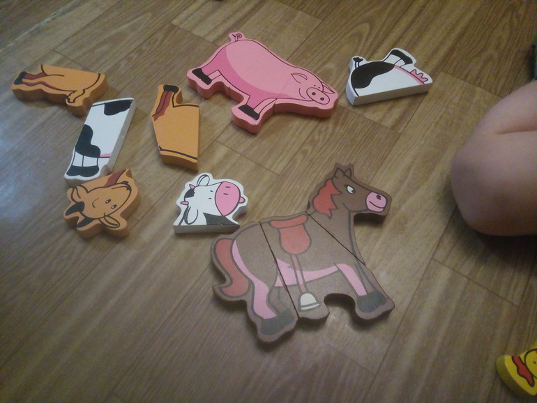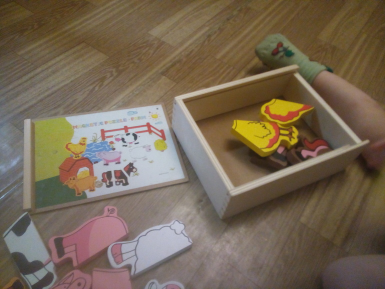 Картонные пазлы пока не идут, ведь деревянные фигурки на магнитах держаться даже если неправильно соберешь. И поиграть можно.