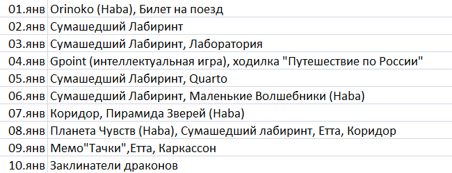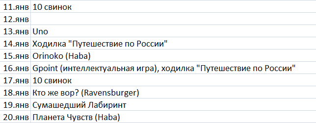 Писать не стала кто играл, но в выходные обычно всей семьей, а на неделе только мы вдвоем, так как папа уезжает в командировки. Итак, таблица!