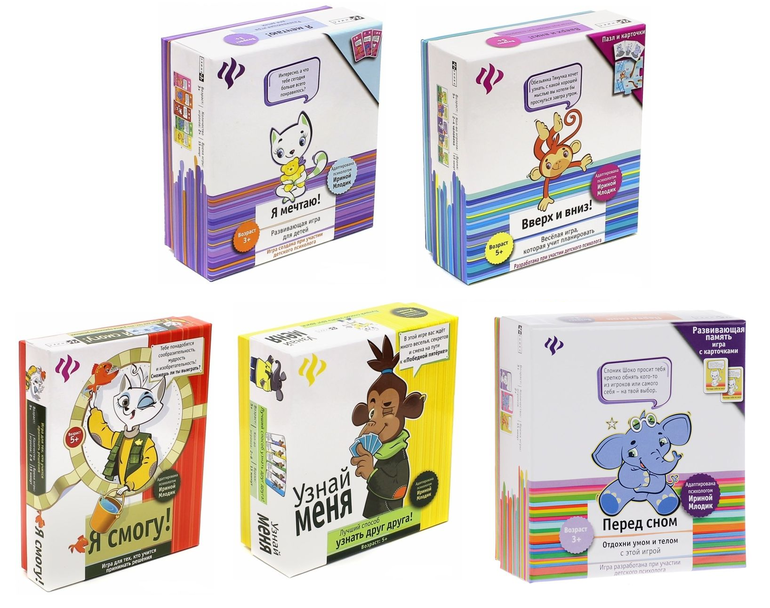 У издательства «Феникс-Премьер» вышло пять игр для малышей от 3 до 6 лет. Они разработаны израильскими психологами, а адаптированы Ириной Млодик. В процессе игры участники воссоздают ситуации, чувства, реакции, фиксируя их и распознавая их причины. Большое практическое значение игр умело сочетается с увлекательной формой - в процессе вы познакомитесь с главными героями и по совместительству вашими помощниками (причем для каждого возраста есть свои персонажи), попутешествуете по Амазонке, лучше узнаете своих друзей и будете очень много общаться и смеяться!