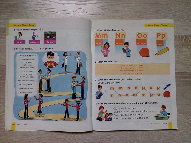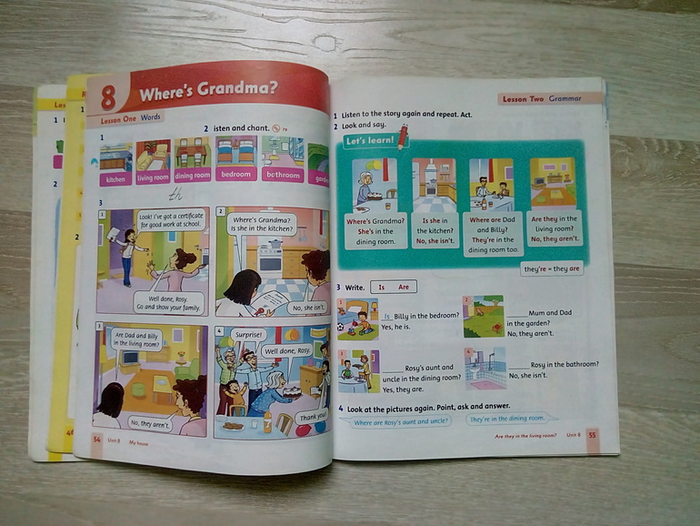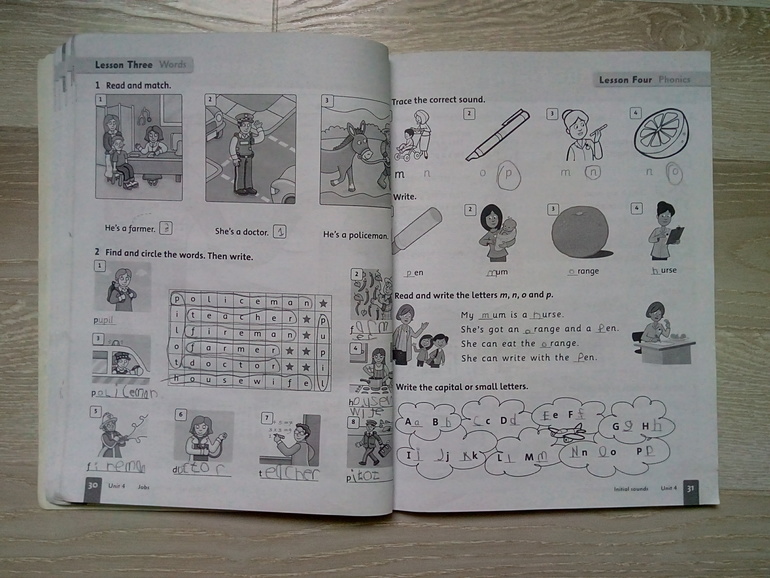 Это тетради использовал учитель в развивающемся центре на втором году обучения. Но они были не основными в занятиях. Они пели песенки (в т.ч. из этого учебника, к учебнику идёт диск), играли в разные игры (с теми же цветными подушками, например, о которых я писала выше), смотрели ролики и пр. Все в комплексе Дане нравилось, а если бы были занятия только по учебнику и тетради, то не уверена, что он бы был в восторге. Язык лучше изучать играючи, а не над учебниками корпеть.