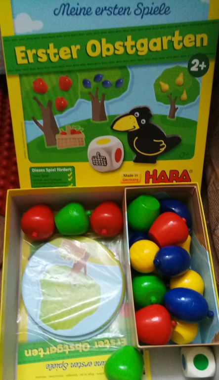 А вот с настольными играми по правилам пока не айс. Считать не хочет, поэтому ходилки отпадают. А если кубик цветной, то не желает мириться с удачей, а ставит кубик цветом, который ему нравится. Я решила взять у Haba фруктовый сад первую версию, которая совсем для малышей. Пусть на ней потренируется в соблюдении правил.