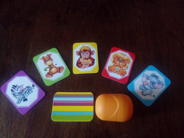 Я уже дала ссылку, там подробнее все можно узнать (там редизайн, 2 варианта). Кратко, игра называется Big Fave от Райнера Книции. В ней 100 карт, 5 животных 5 цветов, цель избавиться от карт, которые делятся между игроками поровну в начале игры, за удачный ход можно дополнительно сбросить любые карты с руки. Выкладывание карт, как в Кверкле: либо одно и то же животное в линии, но цвета рамки разные, либо все животные разные, а цвет рамки один. Вот фото варианта, который я распечатала и от яйцо от Киндерсюрприза, чтобы понять какого размера карты, рубашка - самоклейка из строительного магазина.